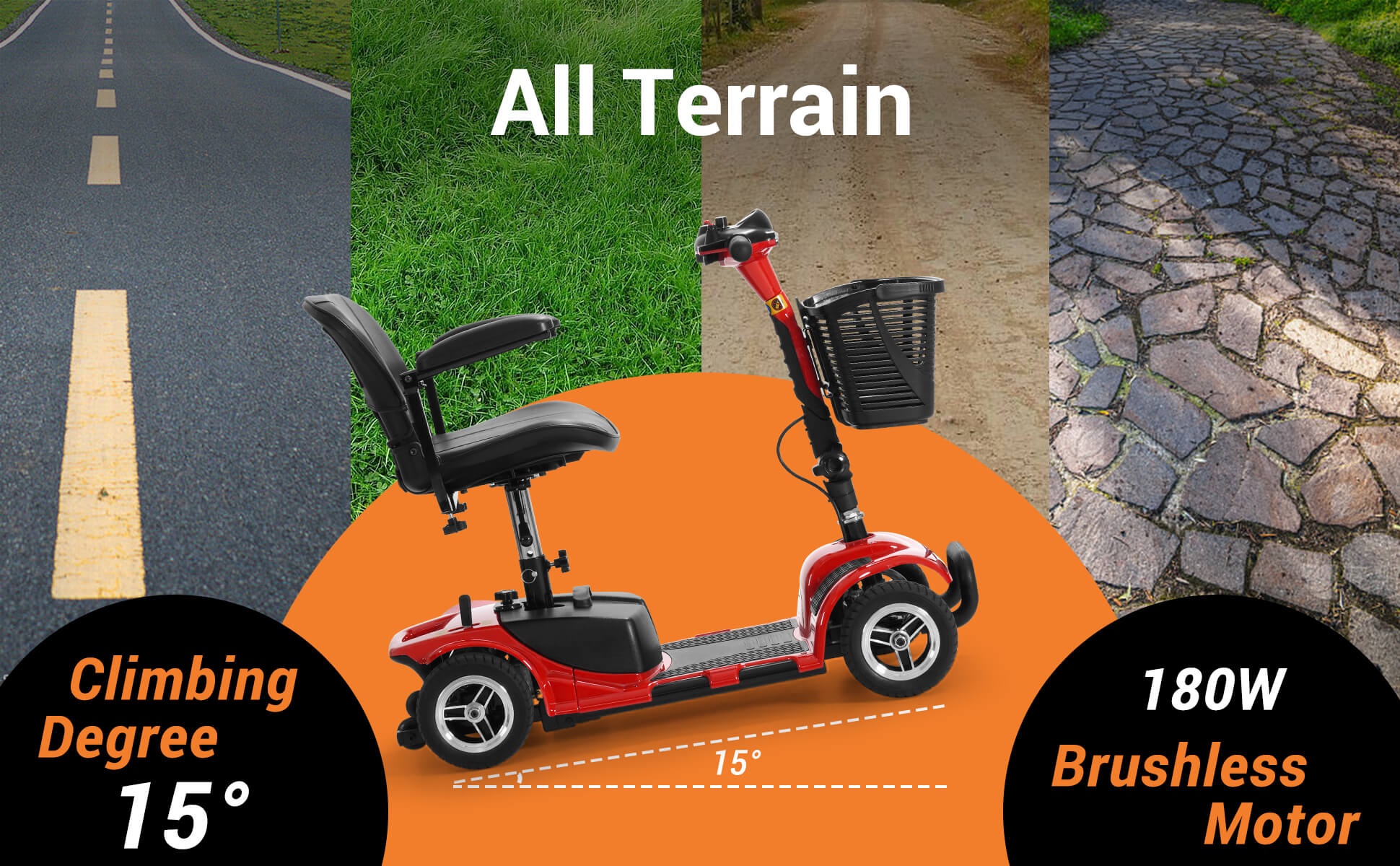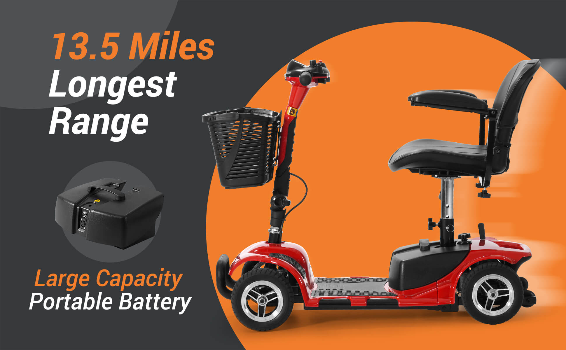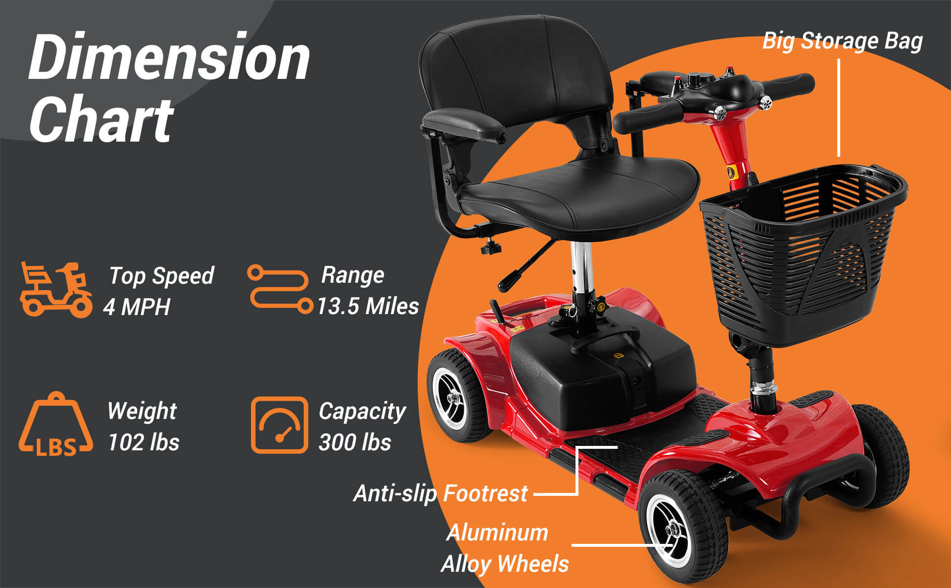 [EASY TO TRANSPORT] The Mobility Scooter can be quickly disassembled into 5 separate pieces, making it easily portable. With a folding tiller and removable seat, each section fits effortlessly into the trunk of most standard vehicles. The heaviest section weighs only 29 pounds, ensuring hassle-free transportation.