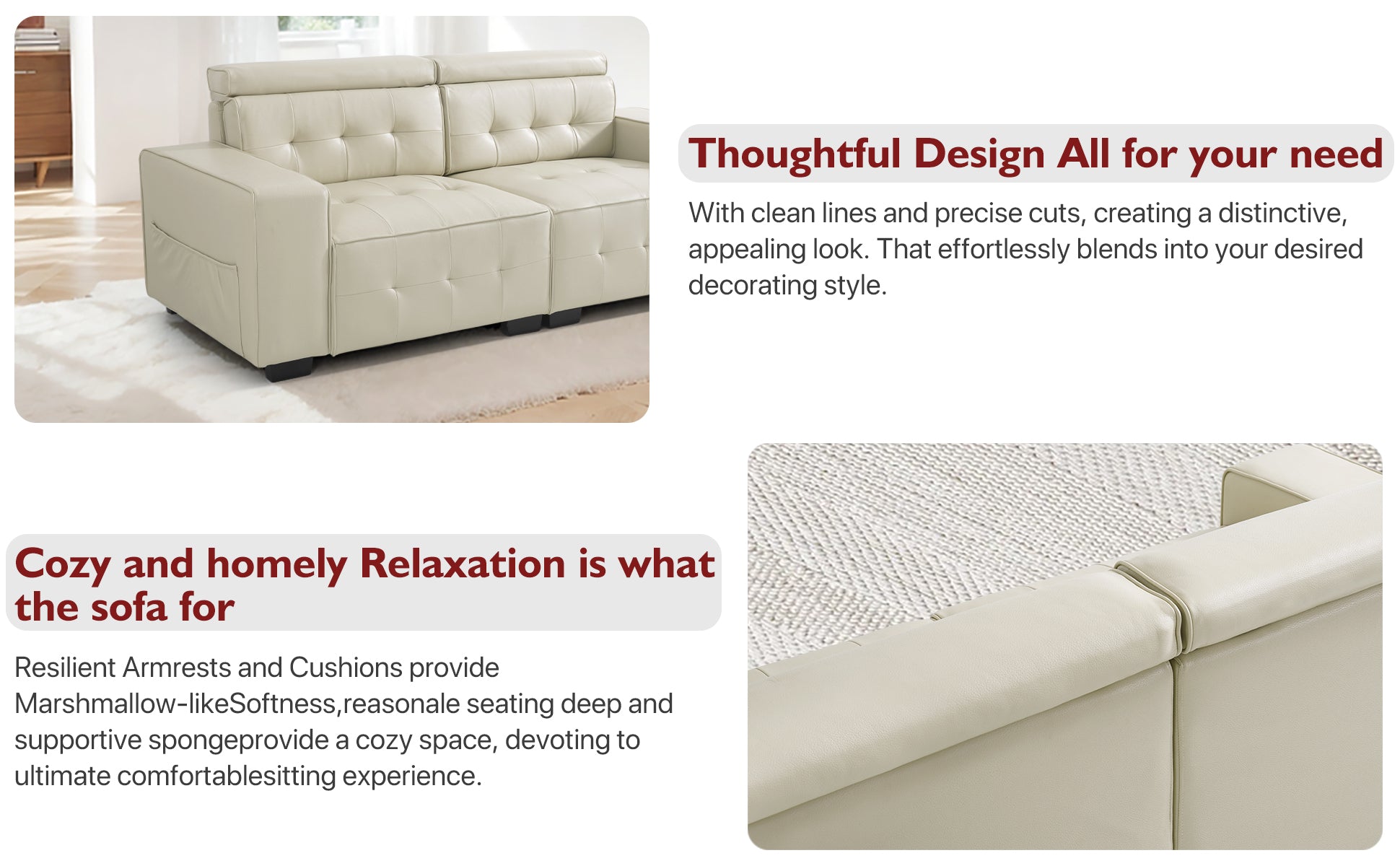 Leather Sofa Couch for Living Room With Adjustable Headrest & Large Armrest